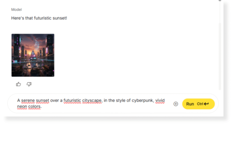 Example prompt: “A serene sunset over a futuristic cityscape, in the style of cyberpunk, vivid neon colors.”